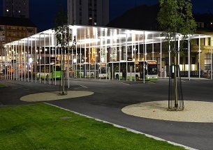 En 2010, un concours d’architecture est lancé par la ville et est remporté par le bureau d’architectes Frundgallina à Neuchâtel. Le projet prévoit l’aménagement de deux couverts. L’un accueillera l’interface des transports publics, l’autre est réservé aux piétons. A l’Est, un emplacement réservé aux véhicules motorisés avec des places à durée limitée et des dépose-minute est prévu.