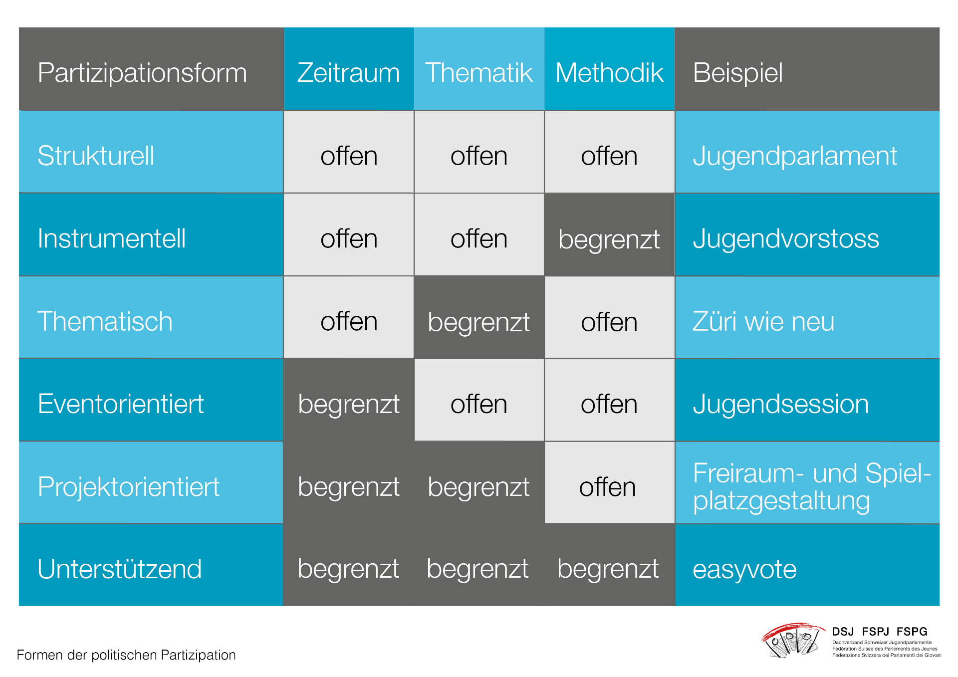 Für zusätzliche Klarheit kann eine Kategorisierung der Partizipationsangebote anhand von sechs Formen sorgen. So können Partizipationsangebote unterschieden werden, je nachdem ob sie bezüglich des Zeitraums, der Thematik und der Methodik offen oder begrenzt sind. Ein Jugendparlament ist beispielsweise eine dauerhafte Einrichtung, in welcher die Jugendlichen selbst bestimmen welche Themen sie mit welchen Mitteln umsetzen wollen – es ist somit ein strukturelles Partizipationsangebot.