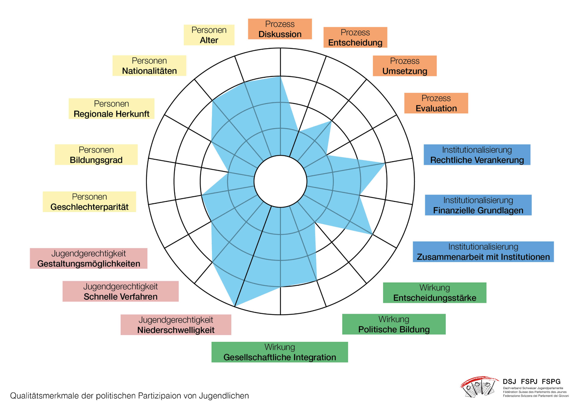 Für die Darstellung wurde ein Spider-Diagramm gewählt. Je stärker die Fläche des Kreises ausgefüllt ist, desto eher entspricht eine Partizipationsform dem Idealbild des DSJ von politischer Partizipation von Jugendlichen. In der Praxis kann ein einzelnes Angebot kaum alle Kriterien erfüllen und es ist wichtig einen Fokus auf gewisse Kriterien zu setzen. Das Ziel sollte sein, dass durch eine vielfältiges Angebot den Kriterien nachgegangen wird.
